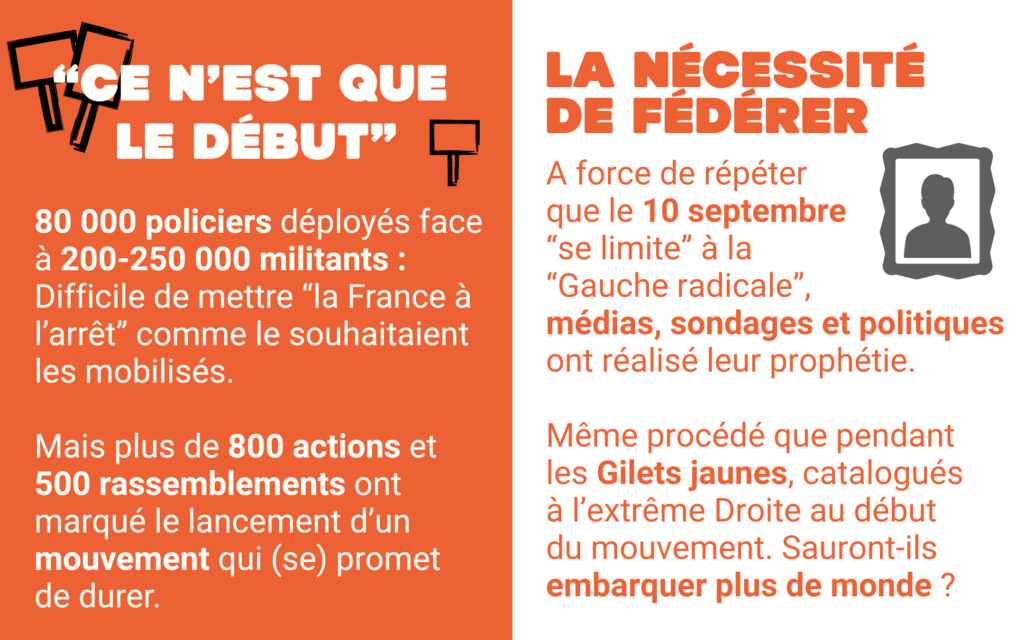Le premier constat chiffré de la journée de mobilisation du 10 septembre est intéressant, surtout au regard de la répression policière. Il montre que la machine est lancée, malgré les tentatives de muselage politico-médiatique. Pour un mouvement populaire sans “leaders”, c’est symptomatique d’une vraie colère. Affaire à suivre le 18 septembre avec les syndicats mobilisés. Et Lecornu 1er (ministre).