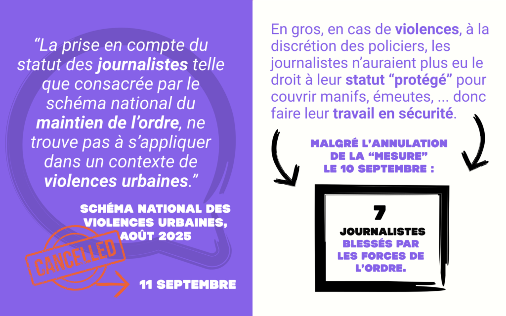 Le 10 septembre, 7 journalistes ont été blessés par les forces de l’ordre rapporte RSF. Un chiffre inquiétant qui fait suite à la fragilisation du statut des journalistes dans un guide opérationnel des forces de l’ordre. La recommandation a “disparu” ce 11 septembre, après sa mise en lumière médiatique et une audience au Conseil d’Etat. La suggestion en dit quand même long sur leur vision du droit à l’information.