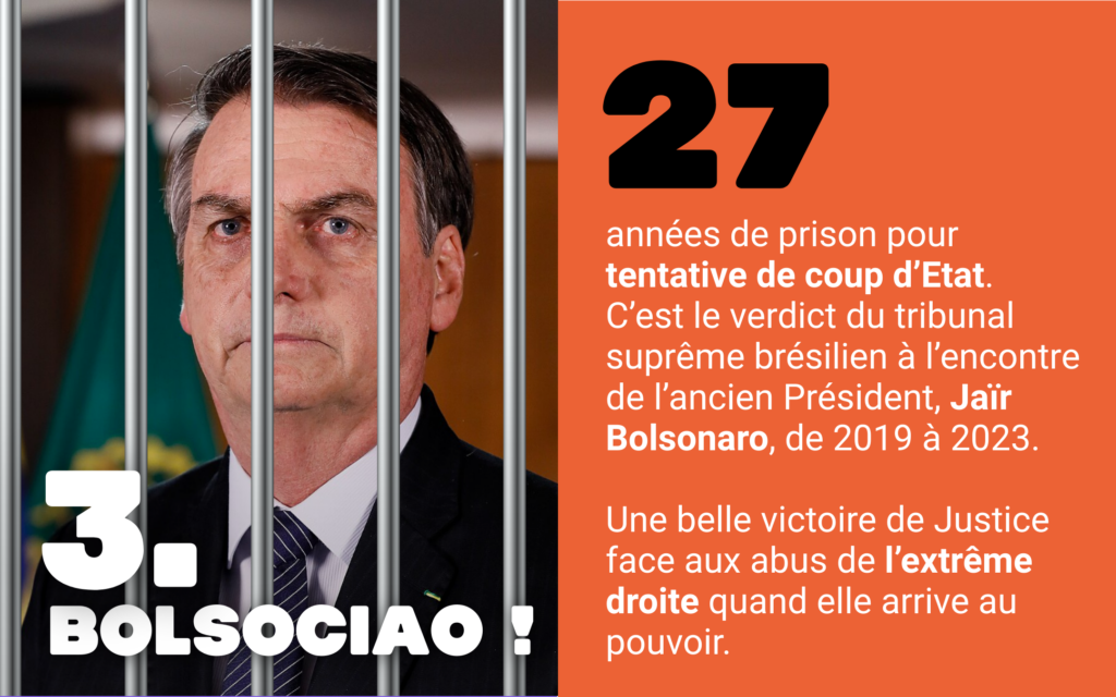 On ne se réjouit que rarement de mises sous écrou mais quand l’extrême droite brésilienne, plus précisément Jair Bolsonaro, se retrouve avec une peine de 27 ans de prison pour tentative de coup d’Etat, on se dit que la Justice fait quand même bien son travail. Un peu d’espoir quant à nos propres gestions, en Europe, des abus de pouvoir/corruption et autres affaires.