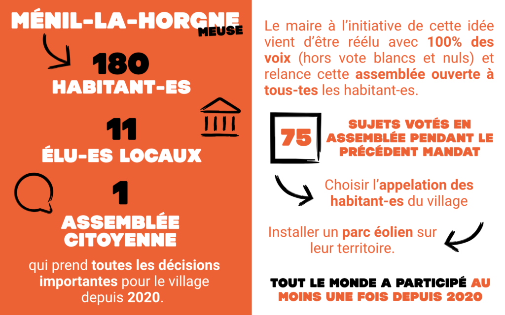 180 habitants de la Meuse ont choisi de “tout décider ensemble”. Depuis 2020, le maire Claude Kaiser, fraîchement réélu en mars, a mis en place une assemblée citoyenne permanente et ouverte à tous-tes. Une fois tombé-es d’accord, c’est alors le petit conseil municipal (11 sièges) qui entérine la décision. “On est enfin obligé de se parler” livre un habitant à Fakir (dont le reportage a lui-même été voté par l’assemblée).