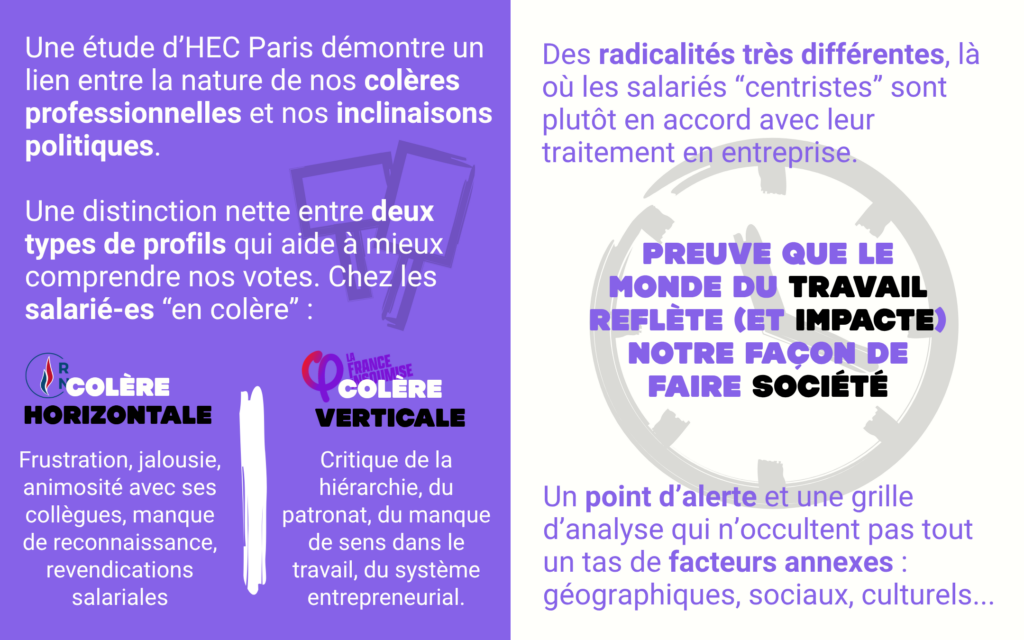 Selon une étude d’enseignants chercheurs d’HEC, notre situation professionnelle expliquerait la radicalité de nos votes. Du moins chez les citoyen-nes salarié-es. Leur étude sur presque 4000 salarié-es montre deux colères distinctes, expliquées dans The Conversation : l’une horizontale, envers ses collègues, frustration jalouse, manque de reconnaissance, sentiment de mépris voire d’isolement, revendications salariales. Cette colère horizontale est celle de travailleur-ses qui votent RN, à l’extrême droite. A l’inverse, la colère des votants LFI est plus verticale : contre le patronat, la hiérarchie. Une critique du système entrepreneurial mais aussi du manque de sens dans son job. Deux colères donc, l’une envers ses pairs, l’autre envers sa hiérarchie, et deux votes distincts : extrême droite et gauche radicale.