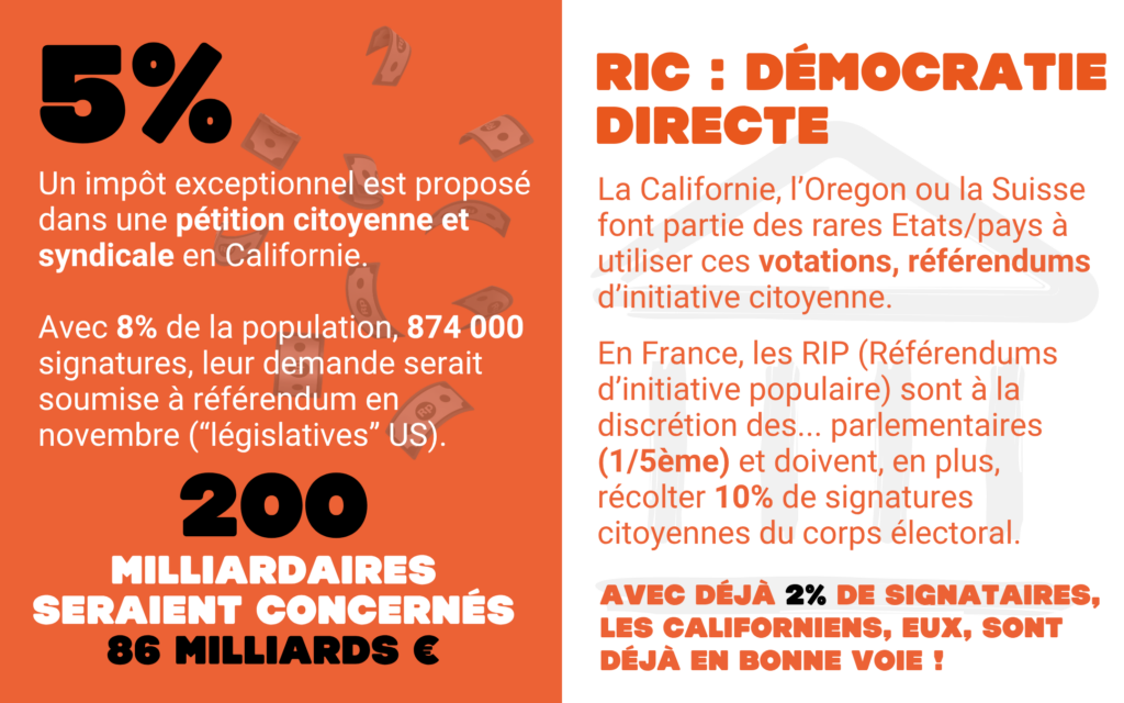 Un syndicat et des citoyen-nes viennent de lancer une pétition pour taxer les milliardaires californiens. Avec suffisamment de signatures, la législation de Californie prévoit un référendum, accolé au vote des “midterms” (législatives de mi-mandat prévues en novembre 2026) étasuniennes. Avec un quart des signatures déjà récoltées, Basta! pressent que ce référendum aura bien lieu. La Californie fait partie de ces rares laboratoires de démocratie directe (la Suisse et ses votations ou l’Oregon) et 8% du corps électoral peuvent imposer ces questions législatives contraignantes.