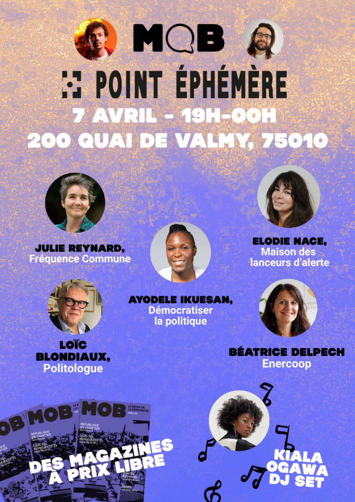 C’est la question qu’on va se poser mardi 7 avril au Point Ephémère à Paris autour d’une table ronde de haute volée ! Une soirée au rythme des grandes rubriques de notre magazine : le chantier des institutions (avec Loïc Blondiaux, politologue), les enjeux de représentation politique (Ayodele Ikuesan, Démocratiser la politique et Julie Reynard, Fréquence Commune), la défense des contre-pouvoirs (Elodie Nace, Maison des lanceurs d’alerte) et la démocratie au travail (Béatrice Delpech, Enercoop/Les Licoornes).