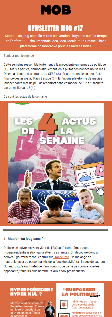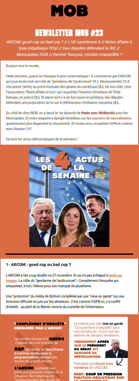 Vous préférez nous suivre par mail, une fois par semaine, plutôt que sur les réseaux ? Vous êtes au bon endroit ! Tous les lundi, on vous partage les actualités de la semaine. Une mini revue de presse des enjeux démocratiques. On vous raconte aussi le média : nos actus, nos coulisses mais aussi des recommandations de la rédac’. En bref, s’informer et vous donner les moyens d’agir et de jouer collectif.